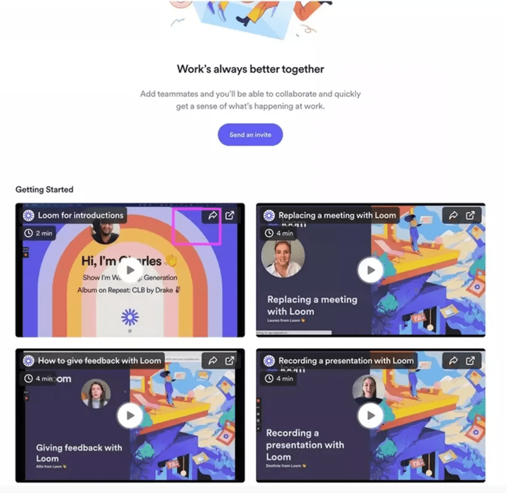 Ejemplo: Loom abandonó el uso de muchos representantes de ventas en favor de un modelo de incorporación de bajo contacto. Para ello, Loom utiliza múltiples demostraciones en video para mostrar a los nuevos usuarios cómo completar diferentes tareas.